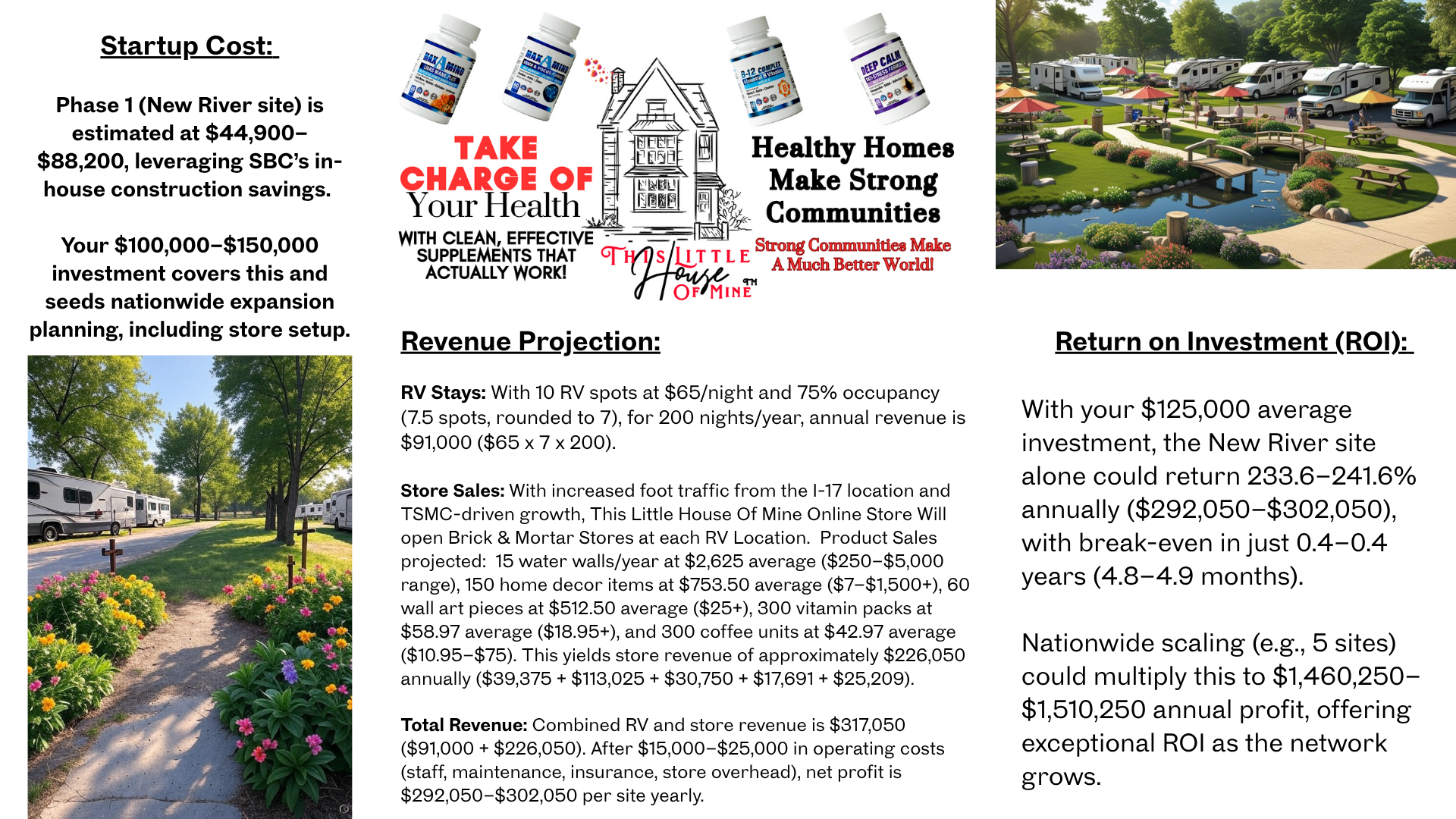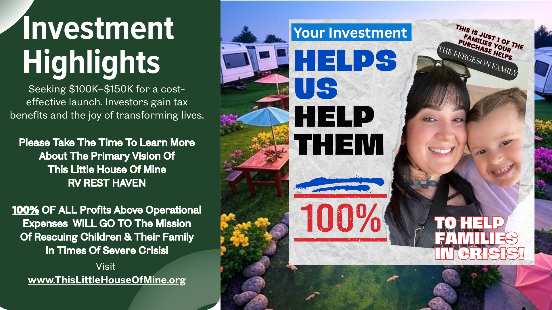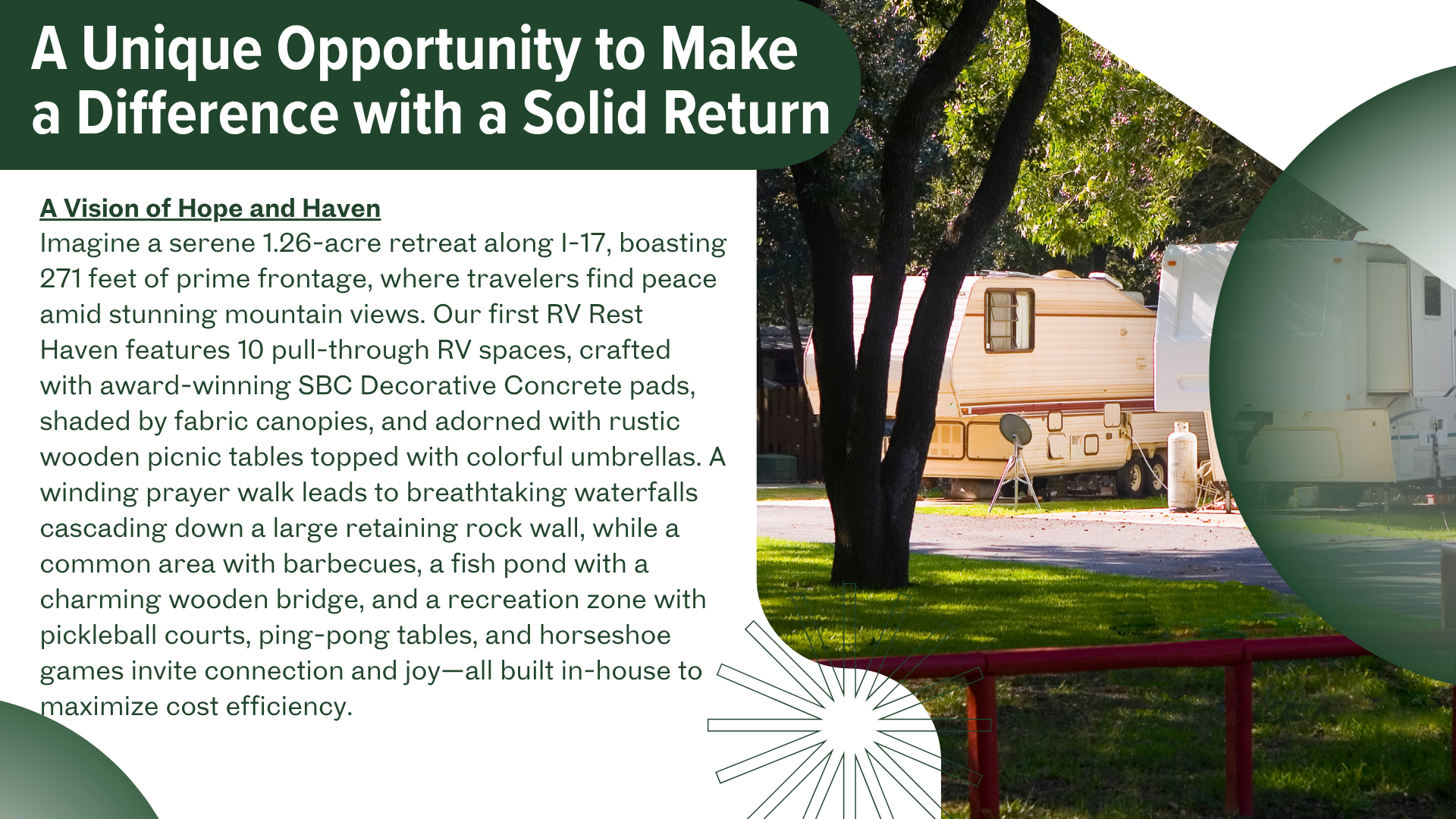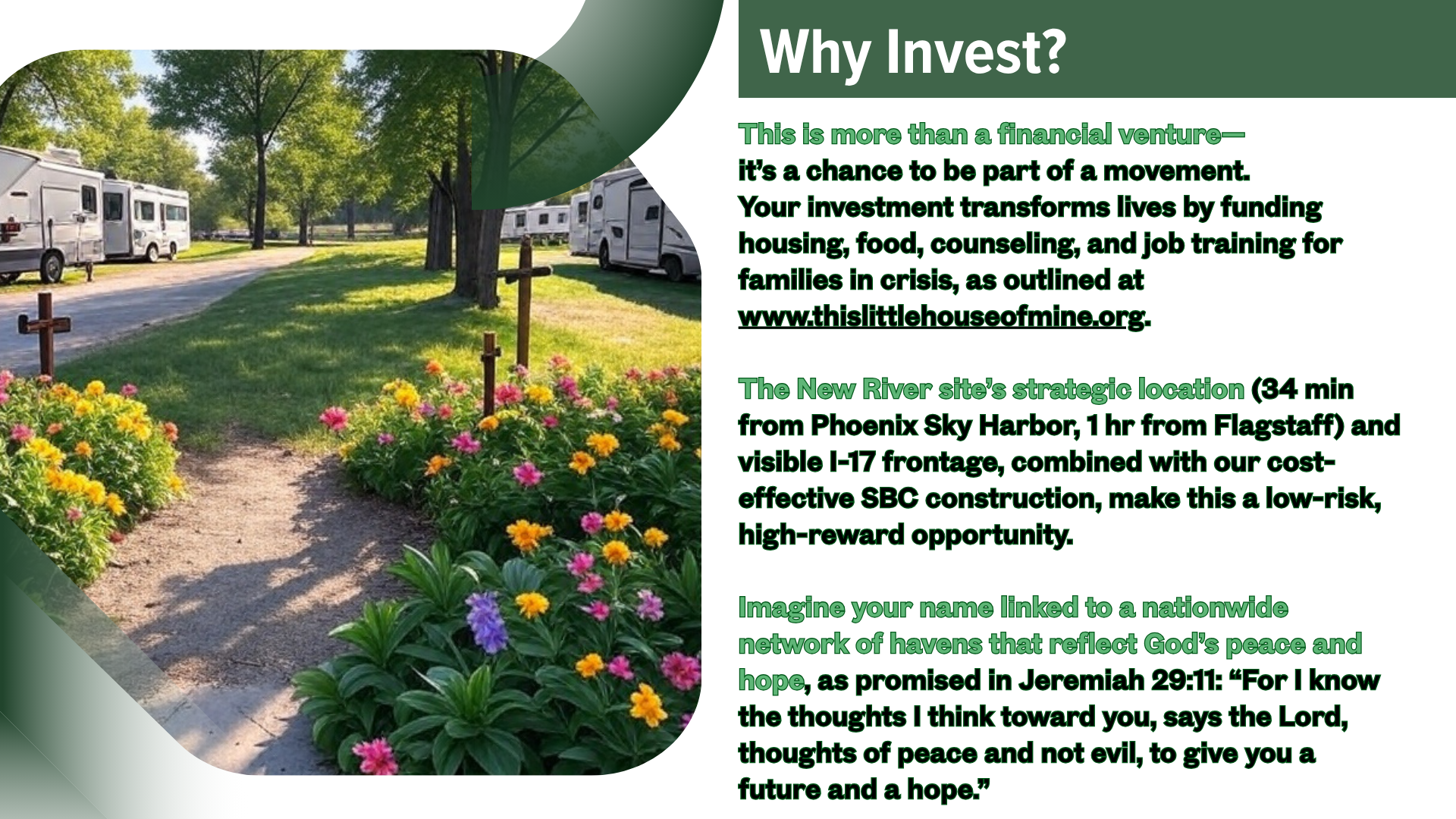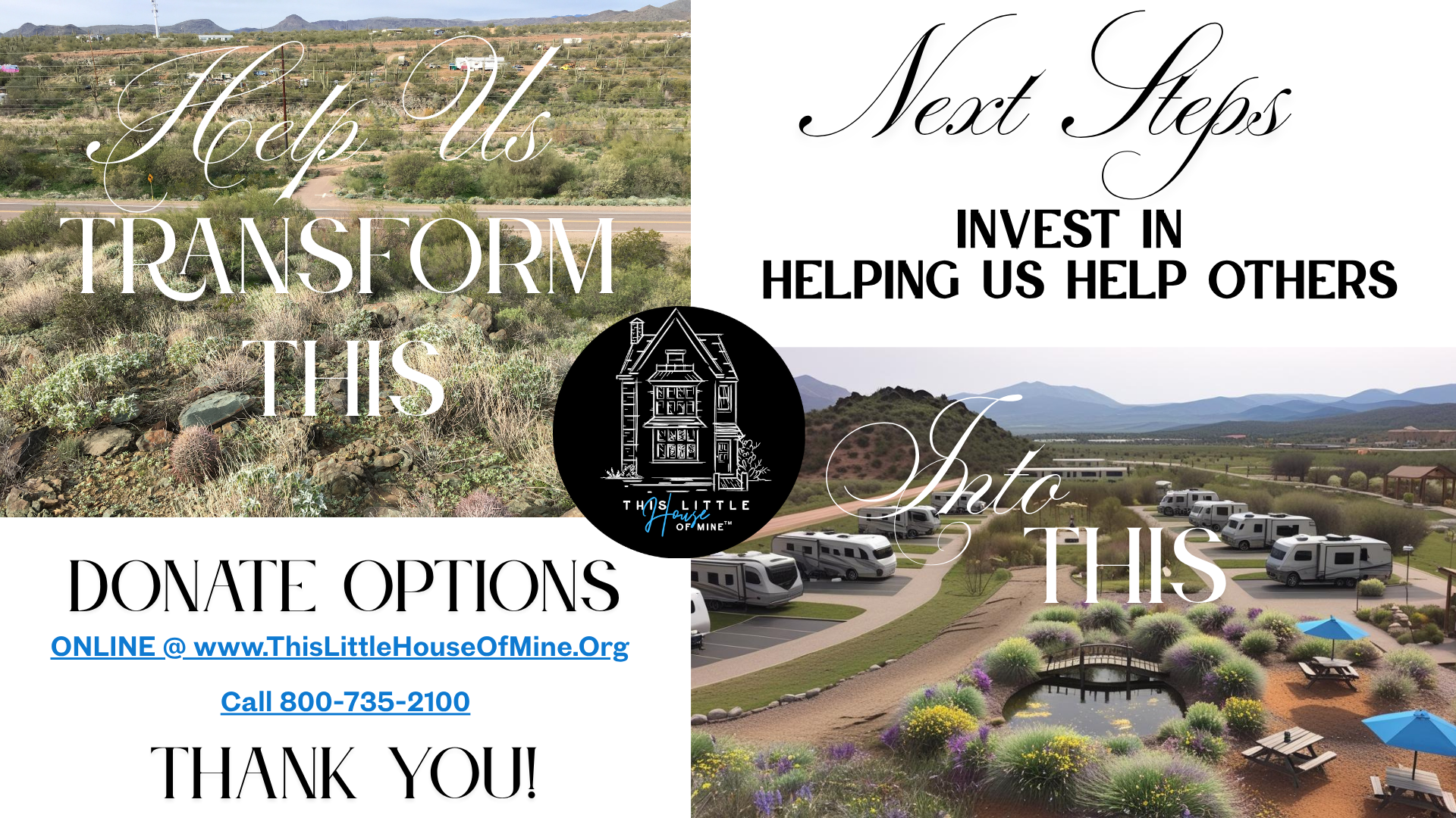 Invest in Hope: Support "This Little House of Mine" RV Haven and Transform Lives! Join "This Little House of Mine," a 501(c)(3) nonprofit, in launching a one-of-a-kind RV rest stop in New River, AZ! Located along I-17 with 271’ of frontage, this serene 1.26-acre retreat features 10 pull-through RV spaces, crafted with award-winning SBC Decorative Concrete pads, shaded by fabric canopies, and enhanced with rustic wooden picnic tables topped with colorful umbrellas. A winding prayer walk leads to stunning waterfalls cascading down a large retaining rock wall, complemented by a common area with barbecues and a fish pond crossed by a charming wooden bridge—all built in-house to save costs. 100% OF ALL Profits Above Operational Expenses WILL GO TO The Mission Of Rescuing Children & Their Family In Times Of Severe Crisis!